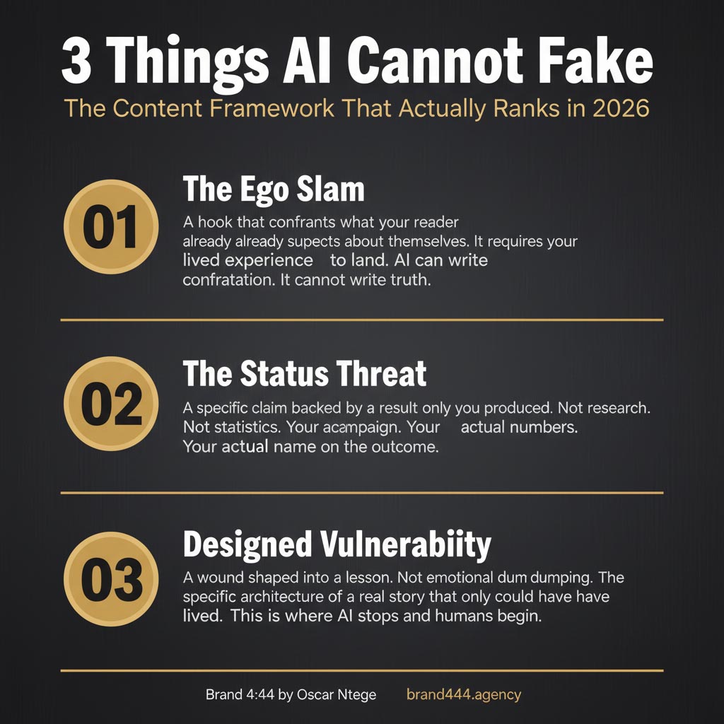 Write content that requires your specific biography to exist. Your prison cell. Your seven failed businesses. Your client who used police to avoid paying a balance. Your documentary that got four likes. Your photography school that reached 35,000 students. These are not just stories. They are proof that a real human with real skin in the game is speaking. AI can summarize the internet. It cannot summarize your life. That gap is your unfair advantage.